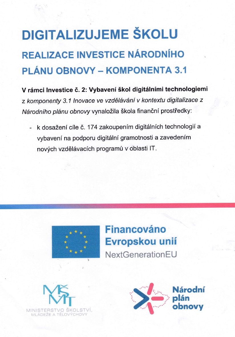 V rámci lnvestice č. 2: Vybavení škol digitálními technologiemi z komponenty 3.1 Inovace ve vzdělávání v kontextu digitalizace z Národního plánu obnovy